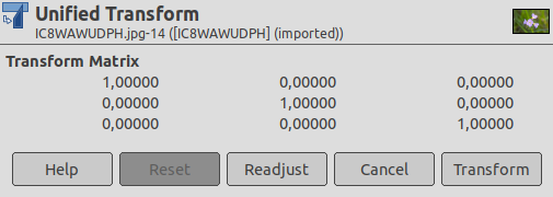 where you find the Reset (very useful when testing), Cancel and Transform buttons. This matrix window appears out of the image or, if the image window is large enough, inside the image window. You cannot edit the values of this matrix, but you can note them to reproduce the same transformation later.