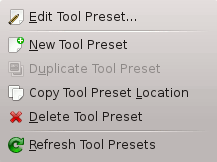 Right-clicking on the Presets Dialog opens a context menu where you find some commands already described with buttons: Edit tool preset, New tool preset, Refresh tool presets. You also find two new commands: