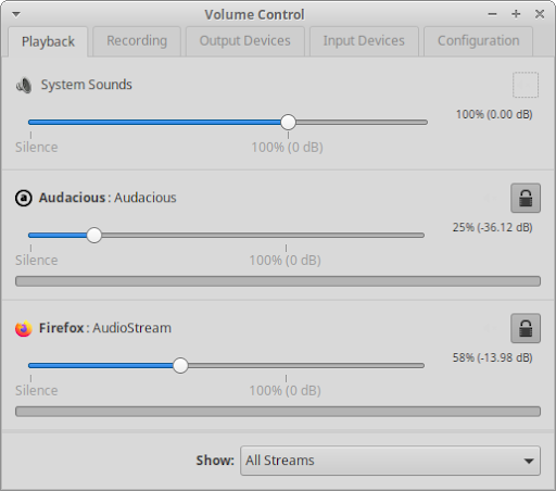 The panel sound plugin gives you easy access to raise, lower and mute the volume of devices, select from multiple input and/or output devices when applicable, as well as control the playback of various audio and video media players. The Audio mixer... entry at the bottom of the plugin popup window will open the PulseAudio Volume Control settings dialog.
