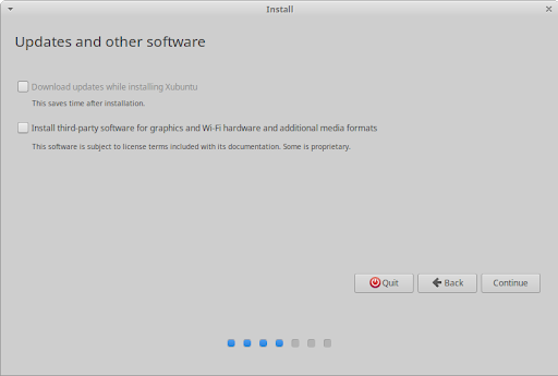 After clicking the button, you will arrive at the Updates and other software screen. There you have the options to download updates during the installation, if you have an internet connection, and whether to install third-party software, like the Nvidia graphics card driver and multimedia codecs for playing media files. It is recommended to have both of them checked.