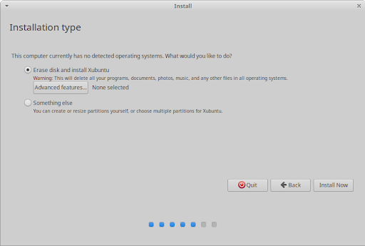 The next screen of the installer is the Installation type screen, which will vary in its list of installation and reinstallation options depending on which operating system(s) are currently on your hard disk. Regular users are recommended to choose either Erase disk and install Xubuntu, to completely wipe the disk and install Xubuntu as the only OS, or Install Xubuntu alongside [OS], to create a dual boot setup with Xubuntu and an existing operating system ([OS] is the existing OS, e.g. Microsoft Windows XP Professional in the screenshot). Advanced users can choose the Something else option, which gives them the ability to create, format, delete and assign partitions.
