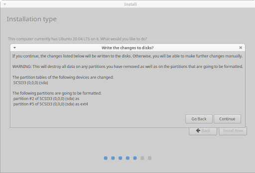 When clicking the button, the installer will show a confirmation dialog before it makes non-reversible changes to your hard disk's partitions and data. Read the changes carefully and, if you agree, click the button.
